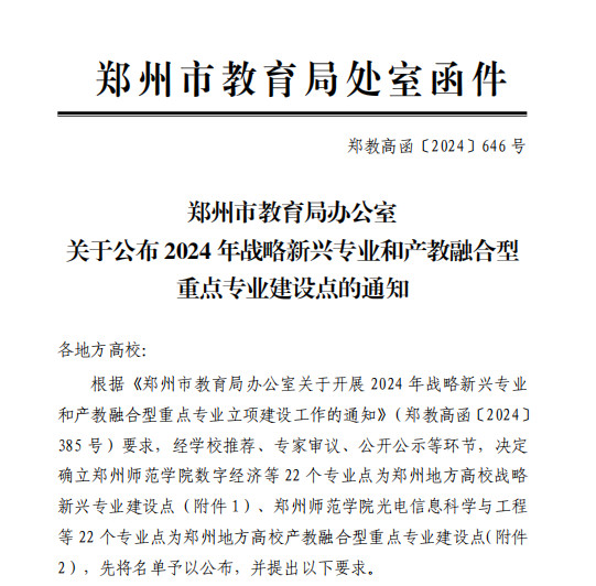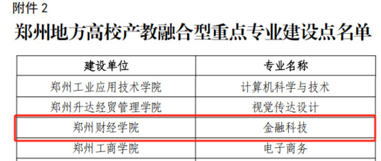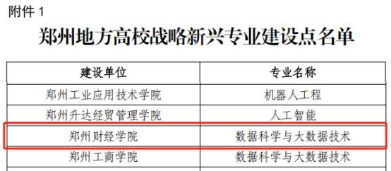 近日,郑州市教育局印发了《关于公布2024年战略新兴专业和产教融合型重点专业建设点的通知》(郑教高函〔2024〕646号),我校信息工程学院数据科学与大数据技术专业获批郑州地方高校战略新兴专业建设点立项建设,金融学院金融科技专业获批郑州地方高校产教融合型重点专业建设点立项建设。