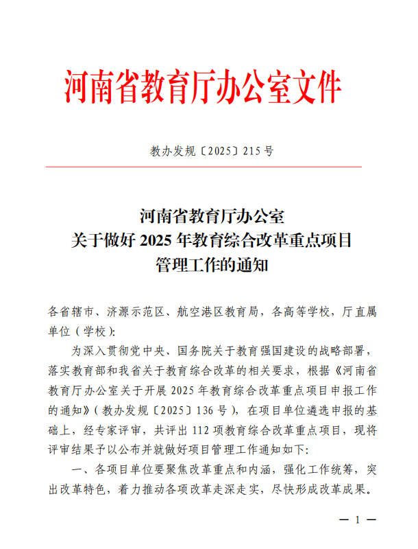 近日,河南省教育厅办公室下发《关于做好2025年教育综合改革重点项目管理工作的通知》(教办发规〔2025〕215号)。我校党委宣传部杨建伟部长申报的《人工智能驱动下网络育人“四新”模式改革》项目获批河南省2025年教育综合改革重点培育项目。